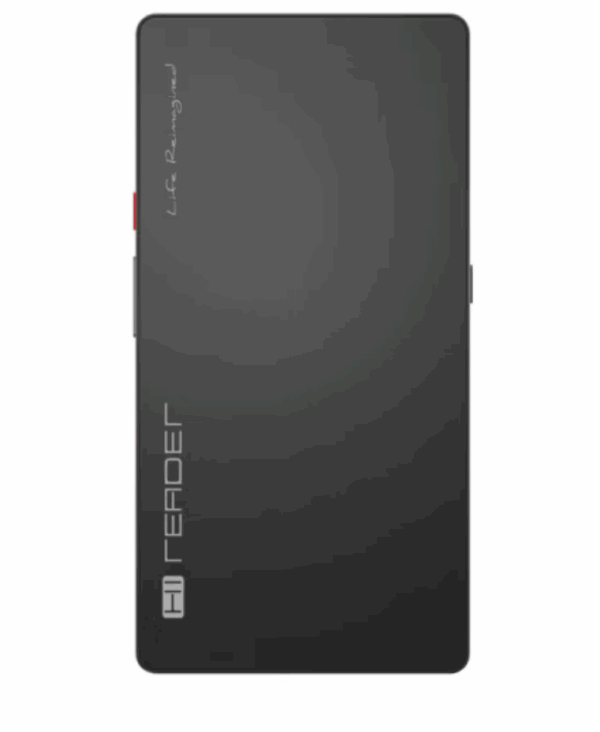 The Hisense Hi Reader comes with a free blue gel case. It was done with lasers to fit the Reader and has room for buttons. This should keep it safe and secure. The retail packaging is black and has some key selling points on the back, along with some regulatory information. It is certified for the Chinese market, where this is primarily sold. However, it does support 12-14 major languages, including English. The device itself is rectangular in shape and the corners are square, with barely any ridges. The structure is basically a block of aluminum. On the back is no perforation, but it does say designed by Hisense, which is cool. On the front, the e-paper screen is underneath a layer of glass, which is flush with the bezel.
